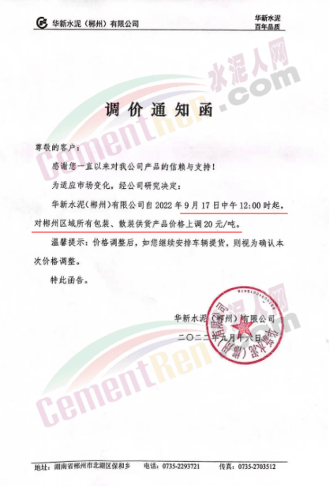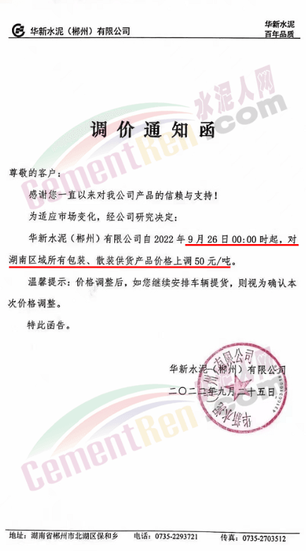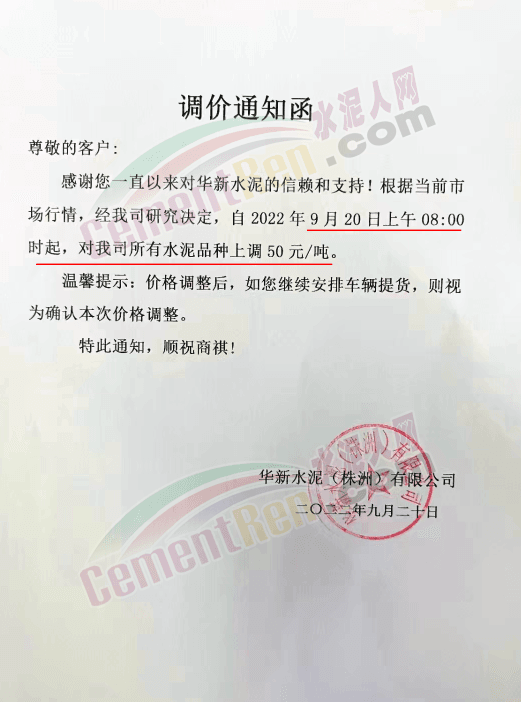 華新水泥(株洲)有限公司通知9月20日上午8時(shí)起,對公司所有水泥品牌上調(diào)50元/噸。