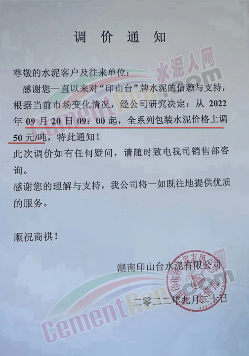 湖南印山臺水泥通知,9月20日9時(shí)起,全系列包裝水泥上調(diào)50元/噸。