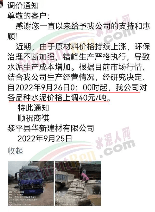 貴州省黔東南苗族侗族自治州黎平縣華新建材有限公司通知,由于原材料價(jià)格持續(xù)上漲,環(huán)保治理不斷加強(qiáng),錯(cuò)峰生產(chǎn)嚴(yán)格執(zhí)行,導(dǎo)致水泥生產(chǎn)成本增加。根據(jù)市場行情 ,自9月26日0時(shí)起,公司對各品種水泥價(jià)格上調(diào)40元/噸。
