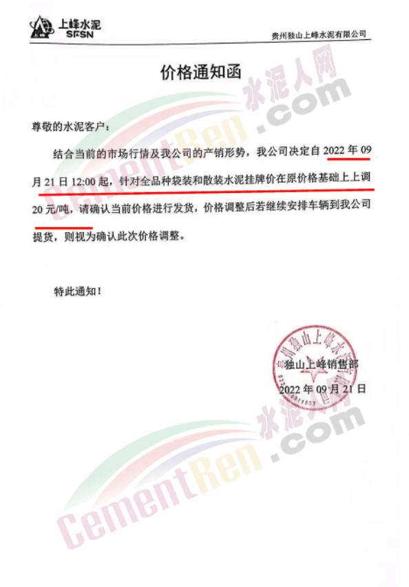 貴州獨(dú)山上峰水泥有限公司通知結(jié)合當(dāng)前的市場行情及公司的產(chǎn)銷形勢,決定自2022年09月21日12:00起,針對全品種袋裝和散裝水泥掛牌價(jià)在原價(jià)格基礎(chǔ)上上調(diào)20元/噸。