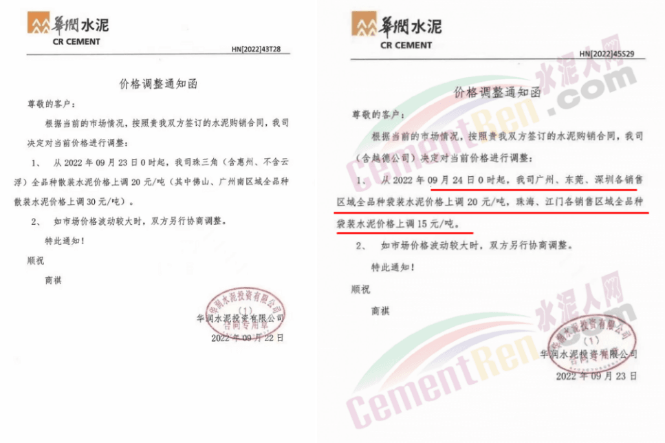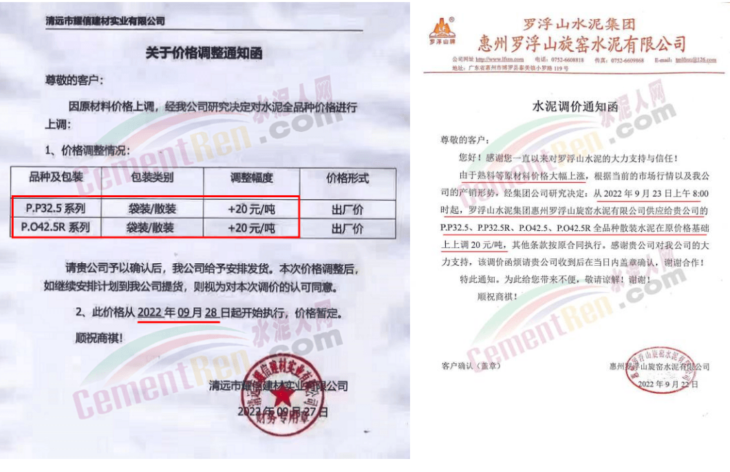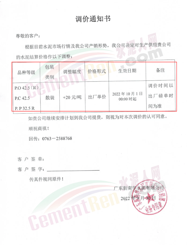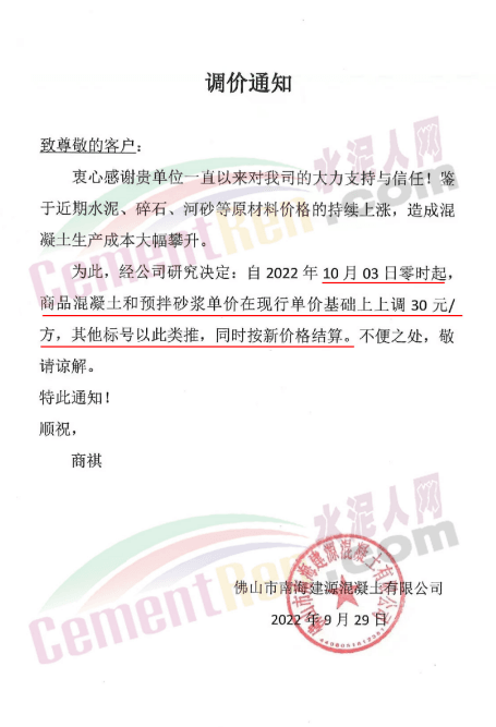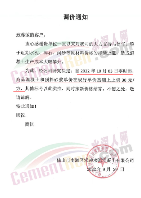 水泥人網(wǎng)通訊員消息:日前,廣東佛山市南海建源混凝土有限公司、佛山市南海區(qū)泌沖水泥混凝土有限公司等企業(yè)通知,鑒于近期水泥、碎石、河砂等原材料價(jià)格的持續(xù)上漲,造成混凝土生產(chǎn)成本大幅攀升。經(jīng)公司研究決定,自2022年10月3日零時(shí)起,商品混凝土和預(yù)拌砂漿價(jià)格上調(diào)30元/方,其他標(biāo)號以此類推,同時(shí)按新價(jià)格結(jié)算。