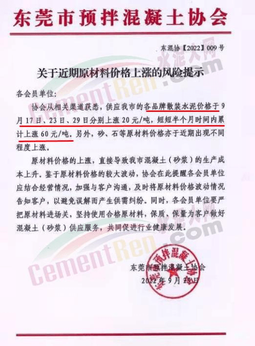 不僅佛山市商砼企業(yè)成本上漲,近期東莞市預(yù)拌混凝土協(xié)會發(fā)布《關(guān)于近期原材料價(jià)格上漲的風(fēng)險(xiǎn)提示》稱,供應(yīng)東莞市的各品牌散裝水泥價(jià)格于9 月17日、23日、29日分別上漲20元/噸,短短半個(gè)月時(shí)間內(nèi)累計(jì)上漲60元/噸。另外,砂、石等原材料價(jià)格亦于近期出現(xiàn)不同程度上漲。原材料價(jià)格上漲,直接導(dǎo)致混凝土(砂漿)的生產(chǎn)成本上升。鑒于原材料價(jià)格的較大波動,協(xié)會在此提醒各會員單位應(yīng)結(jié)合經(jīng)營情況,加強(qiáng)與客戶溝通,及時(shí)將原材料價(jià)格波動情況告知客戶,以避免誤解而產(chǎn)生供需糾紛。