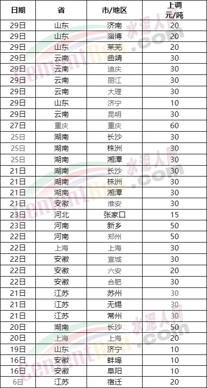 安徽省主要品牌企業(yè)分別于6日、17日、29日前后三次上調(diào)水泥價(jià)格10-20元/噸,累計(jì)上調(diào)30-60元/噸。