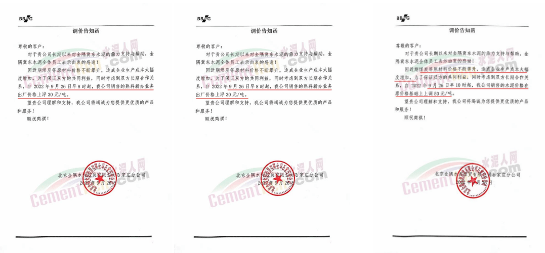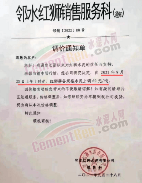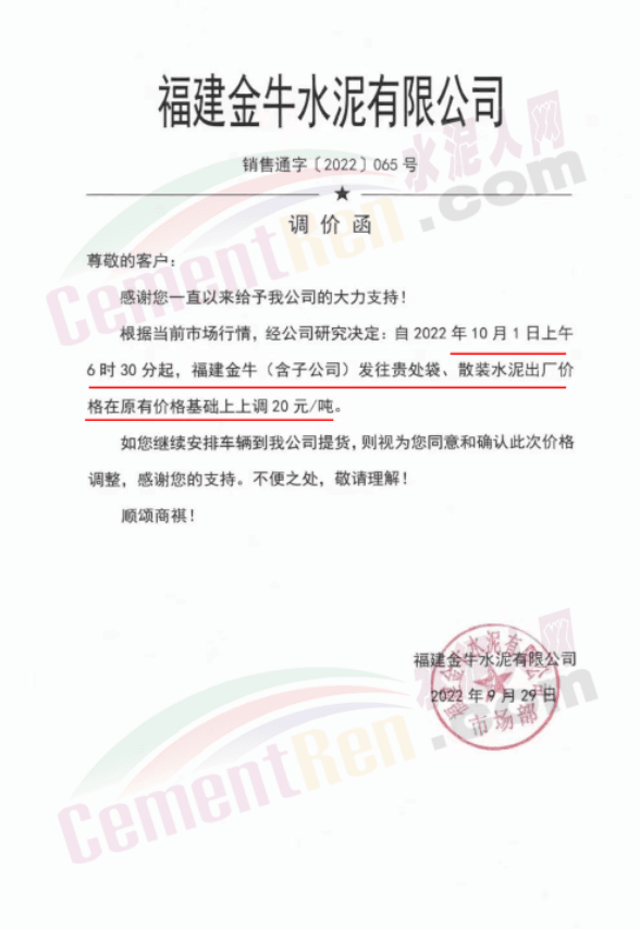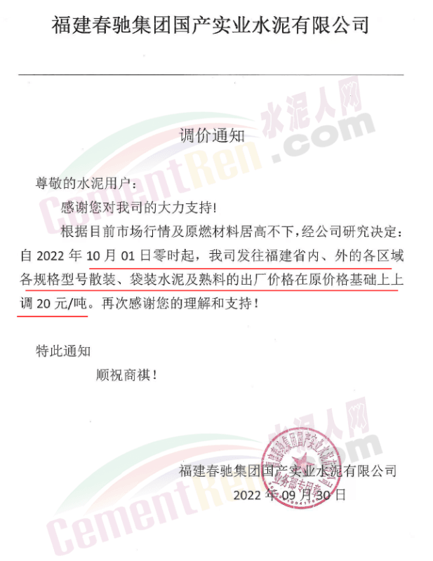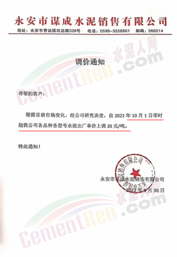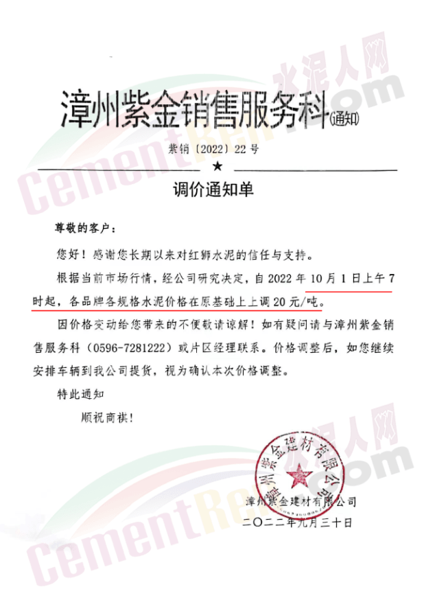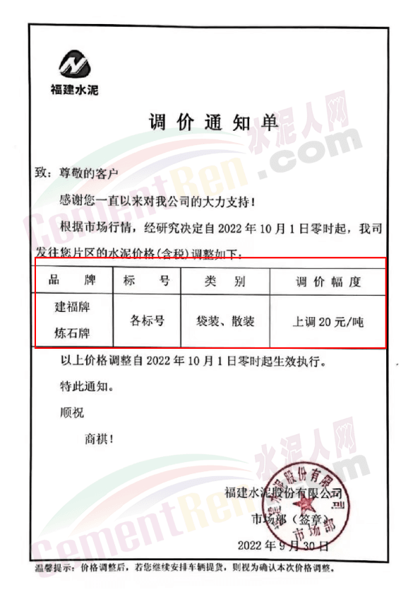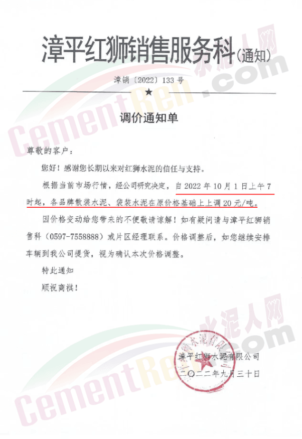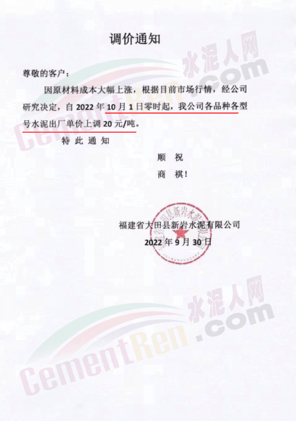 福建水泥銷售經(jīng)理通知,10月1日起所有銷售片區(qū)所有水泥品種上調(diào)20元/噸,預(yù)計(jì)10月10日將再次上調(diào)40元/噸。9月中旬、下旬福建區(qū)域分別上調(diào)10-20元/噸,累計(jì)上調(diào)20-40元/噸。