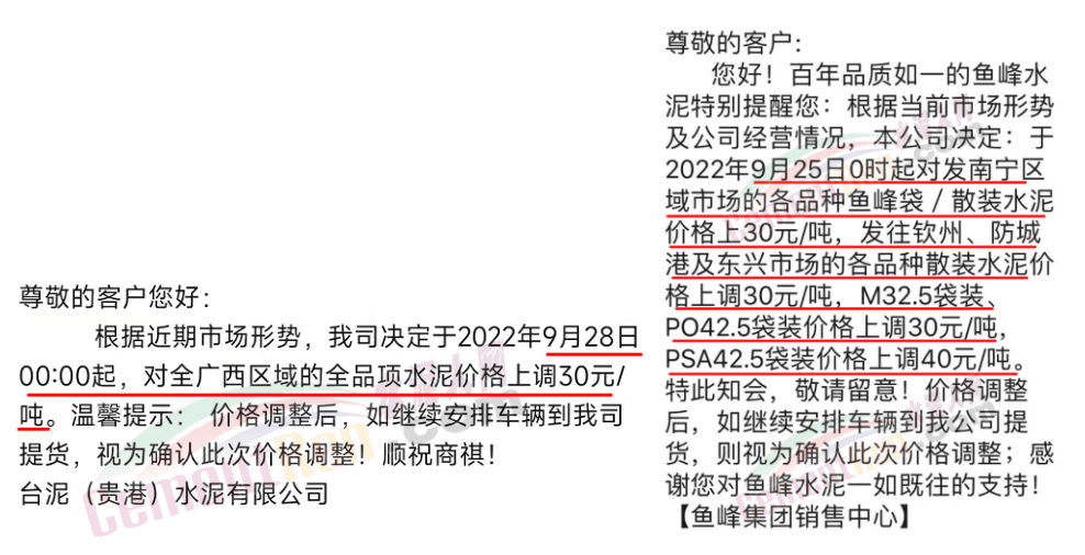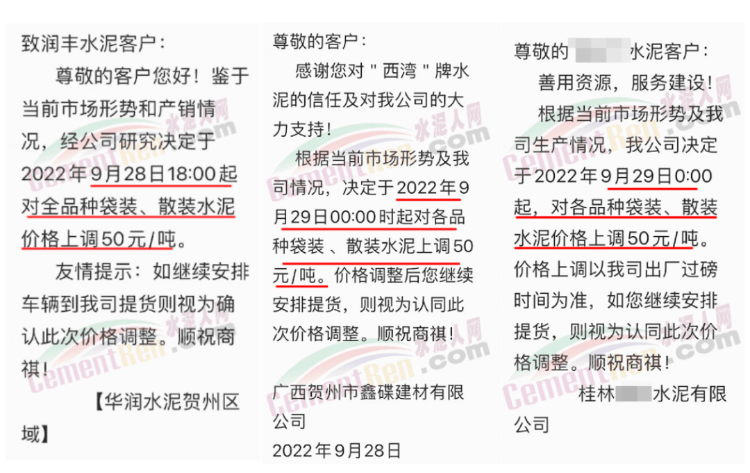 廣東區(qū)域,9月7-8日,上調(diào)10元/噸;9月16-17日,上調(diào)水泥價(jià)格20元/噸;9月21-23日漲20元/噸;9月28-29日上調(diào)20元/噸,累計(jì)上調(diào)60-70元/噸。