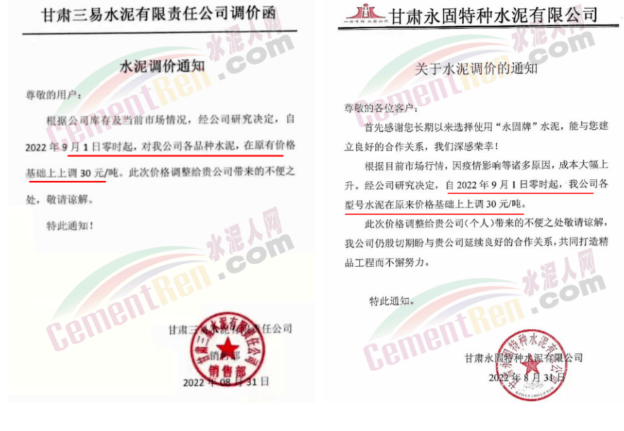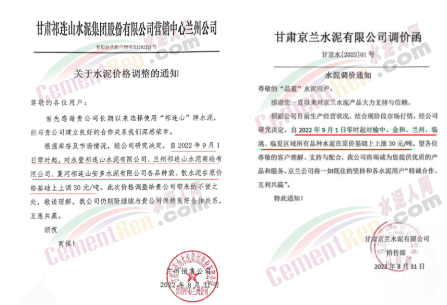 甘肅區(qū)域主要品牌企業(yè)9月1日起上調(diào)水泥價(jià)格30元/噸。