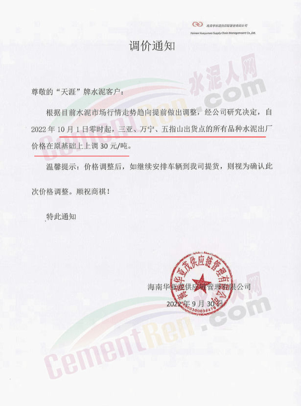 海南水泥上調(diào)30元/噸,熟料上調(diào)15元/噸