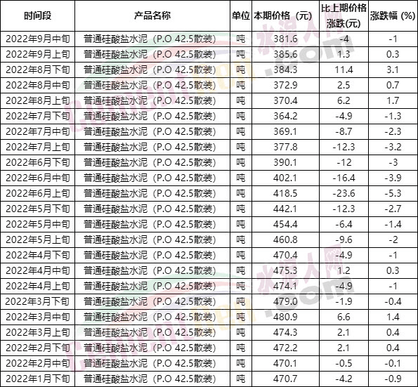從國家統(tǒng)計(jì)局近期公布的流通領(lǐng)域水泥報(bào)價(jià)來看,2022年9月中旬P.O42.5散裝水泥報(bào)價(jià)381.6元/噸,上年同期報(bào)價(jià)為460.4元/噸,價(jià)差78.8元/噸。環(huán)比今年1月下旬470.7元/噸,價(jià)差89.1元/噸。2022年1月下旬至9月中旬之間,P.O42.5散裝水泥最高報(bào)價(jià)出現(xiàn)在3月中旬480.9元/噸,最低價(jià)為7月下旬364.2元/噸,差價(jià)116.7元/噸。