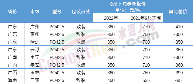 水泥人網(wǎng)信息中心數(shù)據(jù)顯示,今年二、三季度水泥價(jià)格都處于相對較低的狀態(tài),與上年9月中旬相比,廣西區(qū)域27家主要品牌企業(yè)出廠報(bào)價(jià)為260-320元/噸,均價(jià)已在300元/噸以下。上年同期廣西區(qū)域出廠價(jià)最高達(dá)740元/噸,最低也要535元/噸左右,同比價(jià)格下跌275-420元/噸。9月下旬,同比上年同期,華南廣東、廣西區(qū)域各區(qū)域參考均價(jià)與上年同比差價(jià)高達(dá)350-410元/噸。