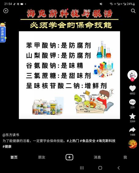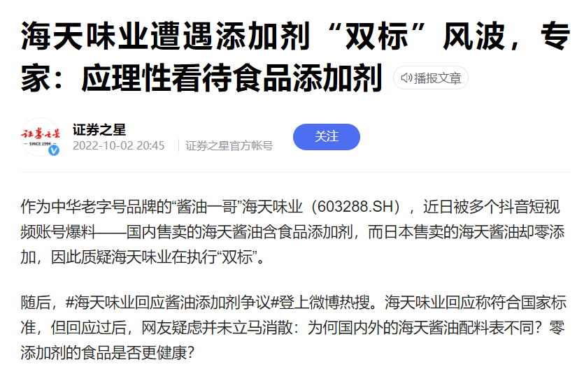 隨著“??怂箍萍?rdquo;視頻博主辛吉飛的持續(xù)爆料,越來(lái)越多的產(chǎn)品出現(xiàn)在觀眾眼前。辛吉飛拍了一個(gè)制作勾兌醬油的方法,雖然沒(méi)指名道姓,但大家還是聯(lián)想到了“醬油一哥”海天味業(yè)。此后,多個(gè)抖音短視頻賬號(hào)爆料——國(guó)內(nèi)售賣(mài)的海天醬油含食品添加劑,而日本售賣(mài)的海天醬油卻零添加,因此質(zhì)疑海天味業(yè)在執(zhí)行“雙標(biāo)”。