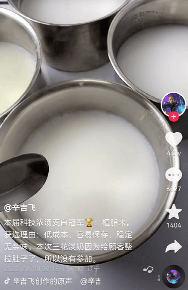 自己制作的羊雜湯之所以是奶白色,需要用牛骨燉煮很長(zhǎng)時(shí)間,結(jié)果該博主直接在清水中加入“一勺三花淡奶”就調(diào)制出了濃稠奶白色的湯。一時(shí)間,“師傅熬高湯七個(gè)小時(shí),我一勺三花淡奶加雞精顧客直呼童年味道”的說(shuō)法火遍全網(wǎng)。