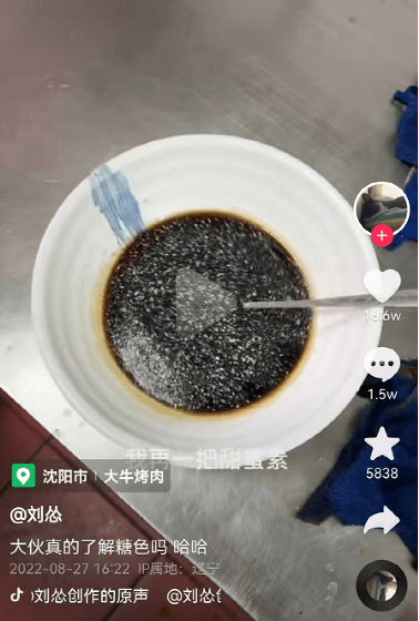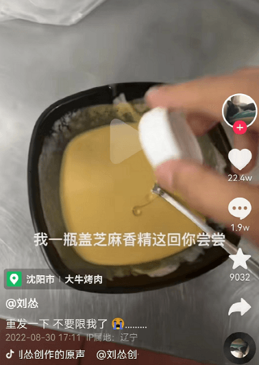 另一位“美食博主”劉慫也為大家?guī)?lái)了“科技食物”的詳細(xì)制作方法。普通的一勺花生醬,加點(diǎn)自來(lái)水,加點(diǎn)食用油,加點(diǎn)焦糖色素,加點(diǎn)芝麻香精后,一碗外面賣(mài)的芝麻醬就做好了。