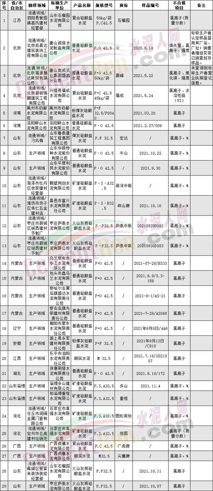 江蘇省市場(chǎng)監(jiān)督管理局通報(bào):1批次水泥不合格,不合格項(xiàng)目為氯離子