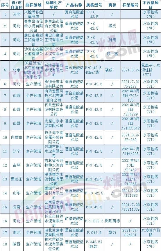 青海省市場(chǎng)監(jiān)督管理局通報(bào):個(gè)別硅酸鹽水泥存在水溶性鉻(VI)、氯離子超標(biāo),對(duì)工程質(zhì)量和生態(tài)環(huán)境造成了安全隱患