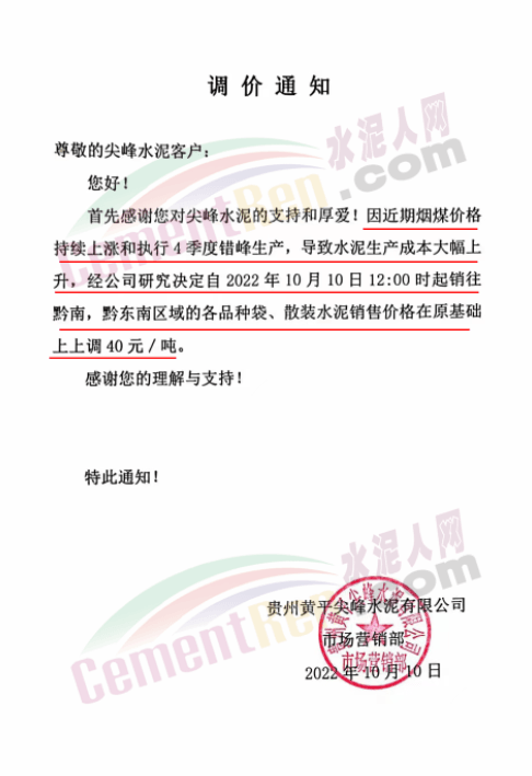 貴州黃平尖峰水泥通知,因近期煙煤價(jià)格持續(xù)上漲和執(zhí)行4季度錯(cuò)峰生產(chǎn),導(dǎo)致水泥生產(chǎn)成本大幅上升,經(jīng)公司研究決定自10月10日起銷往黔南、黔東南以及遵義區(qū)域的各品種水泥價(jià)格上調(diào)40元/噸。