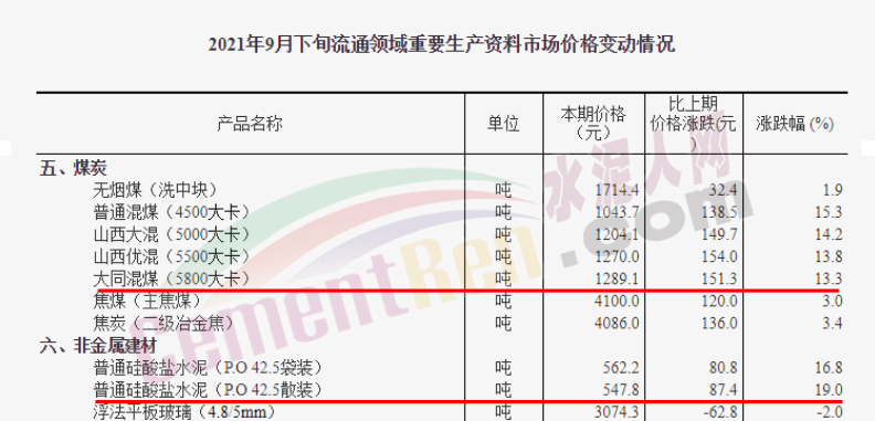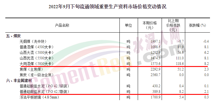 10月9日,國家統(tǒng)計(jì)局公布了2022年9月下旬流通領(lǐng)域重要生產(chǎn)資料市場(chǎng)價(jià)格變動(dòng)情況,水泥人網(wǎng)注意到流通領(lǐng)域煤炭價(jià)格仍處于上行趨勢(shì),各類型煤炭報(bào)價(jià)仍處于1000元/噸以上,其中5800大卡山西大同混煤報(bào)價(jià)1573.6元/噸,較上期上漲118.6元/噸;同比上年同期報(bào)價(jià)1289.1元/噸,上漲284.5元/噸。同期P.O42.5散裝水泥報(bào)價(jià)389.8元/噸,上漲8.2元/噸,漲幅2.1%,仍未突破400元/噸大關(guān);同比上年同期547.8元/噸報(bào)價(jià)下跌158元/噸。