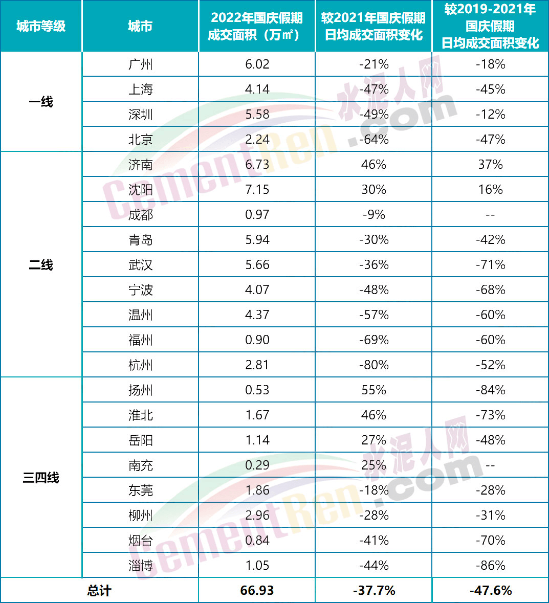 注:北京2021年國慶假期成交數(shù)據(jù)剔除恒大兩個(gè)集中網(wǎng)簽項(xiàng)目;總計(jì)中較2019-2021年國慶假期日均成交面積變化不含成都、南充