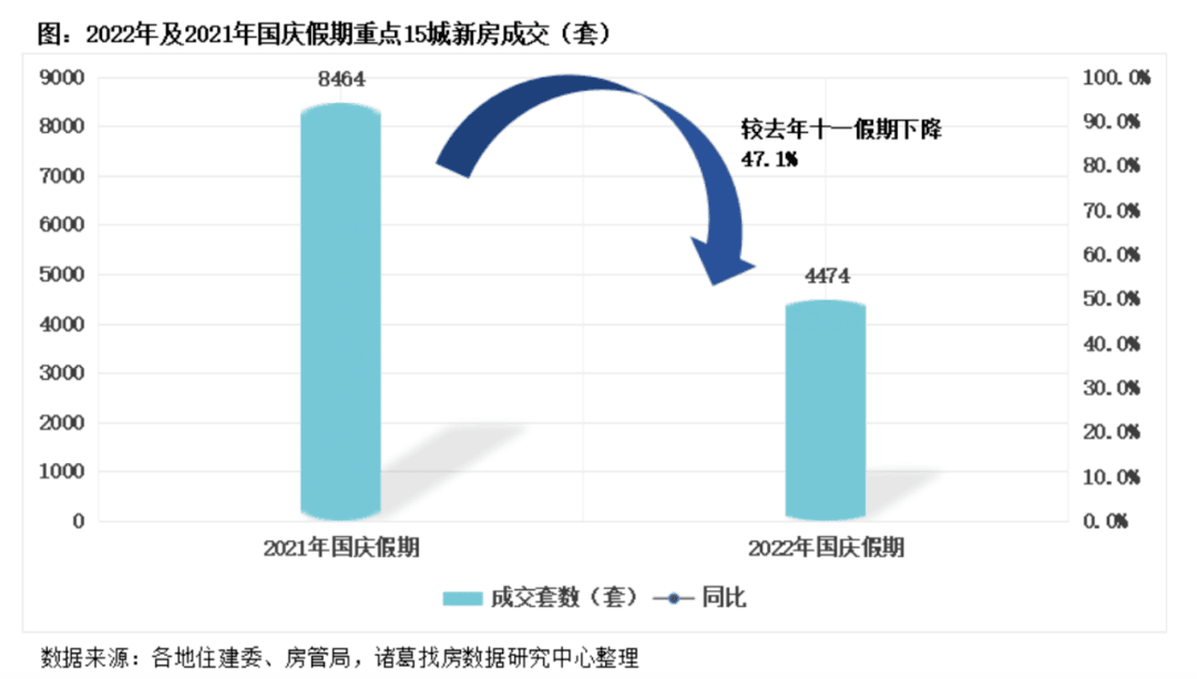 根據(jù)相關(guān)監(jiān)測(cè)數(shù)據(jù),重點(diǎn)15城新房成交4474 套,較去年十一假期下降 47.1%。