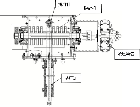 1500~2000mm,負(fù)責(zé)處理平板閘以上結(jié)拱的塊狀料甚至大塊料,中空油缸聯(lián)接羅茨風(fēng)機(jī)到減壓錐內(nèi)部可以替代部分充氣箱功能,以解決架空料的處理難題;下部在破碎機(jī)構(gòu),將溜下到破碎腔的塊狀料破碎成 2 公分左右的小塊,使得小塊能隨粉料一起被斜槽送走,解決在斜槽卸料器拐彎處堵料問題;由于本身破碎腔中自帶約 2.5 公分間隙,對正常粉料卸料沒有影響。如果發(fā)生破碎腔有堵,反而說明里面有塊狀料,這時只要開啟疏堵機(jī),就能快速疏通。由于現(xiàn)場安裝空間所限和提供較強(qiáng)的破碎能力,該系統(tǒng)采用了液壓馬達(dá),羅茨風(fēng)機(jī),與液壓捅料機(jī)構(gòu)合起來集成為一個液壓系統(tǒng)。其設(shè)備示意圖如下: