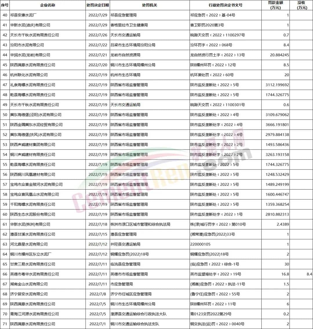 2022年1月至今部分涉及水泥企業(yè)罰沒案