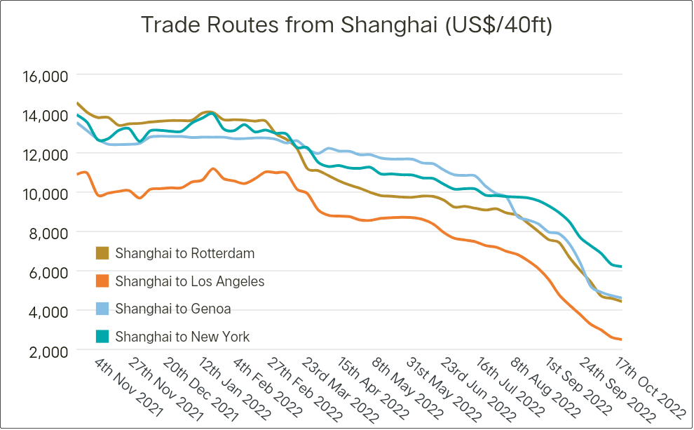國(guó)際航運(yùn)市場(chǎng),從去年的一船難求到如今的無(wú)人問(wèn)津可見(jiàn)一斑,近日,上海至洛杉磯集裝箱指數(shù)正在斷崖式下跌;上海發(fā)往歐洲路特丹港的集裝箱指數(shù)也在急劇下跌;上海發(fā)往意大利熱那亞的集裝箱指數(shù)也難以幸免。這三個(gè)數(shù)據(jù)很明確的說(shuō)明中國(guó)在太平洋、印度洋和大西洋的航運(yùn)指數(shù)正在急劇下降。