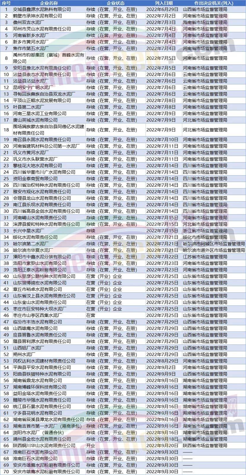 據(jù)水泥人網(wǎng)查詢,近年來被列入嚴(yán)重違法失信的水泥企業(yè)并非只有這一家。僅2022年1月至今就有70家水泥企業(yè)被列嚴(yán)重違法失信企業(yè)名單。