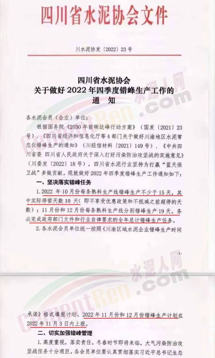 日前,四川省水泥協(xié)會發(fā)布《關于做好2022年四季度錯峰生產(chǎn)工作的通知》提到10月份每條熟料生產(chǎn)線錯峰生產(chǎn)不少于15天,其中實際停窯天數(shù)10天。(即不享受優(yōu)惠政策和不抵減之前超停的天數(shù));11月份和12月份每條熟料生產(chǎn)線分別錯峰生產(chǎn)19天。務必完成政府部門文件和行業(yè)自律要求的全年總計錯峰生產(chǎn)任務。