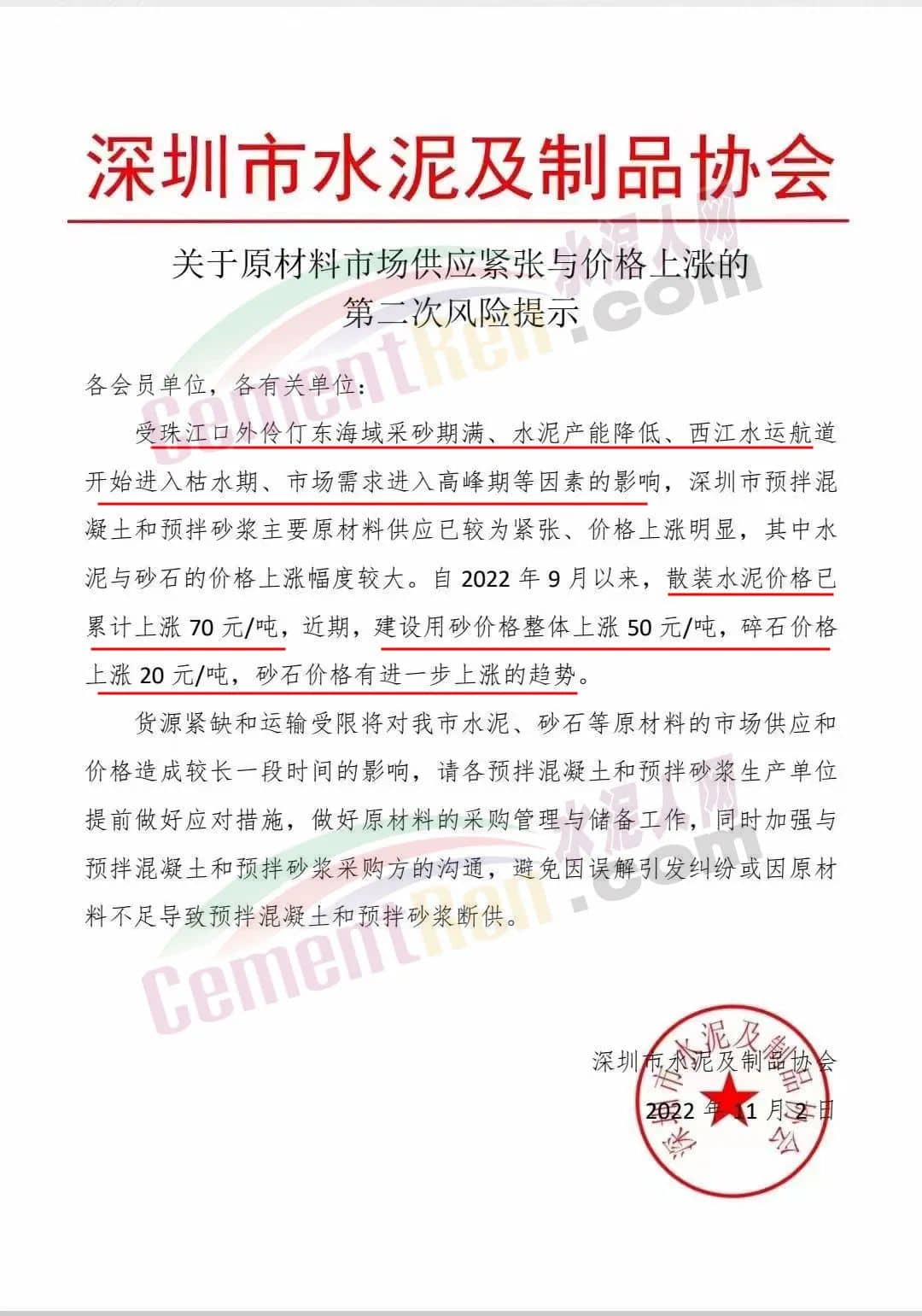 11月2日深圳市水泥及制品協(xié)會(huì)發(fā)布《關(guān)于原材料市場供應(yīng)緊張與價(jià)格上漲的第二次風(fēng)險(xiǎn)提示》稱,受采砂期滿、水泥產(chǎn)能降低、西江水運(yùn)航道開始進(jìn)入枯水期、市場需求進(jìn)入高峰期以及水泥、砂石報(bào)價(jià)上漲等因素的影響,珠三角區(qū)域局部市場出現(xiàn)材料供應(yīng)緊張情況。