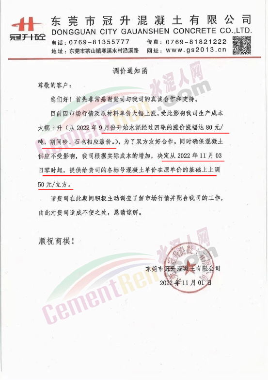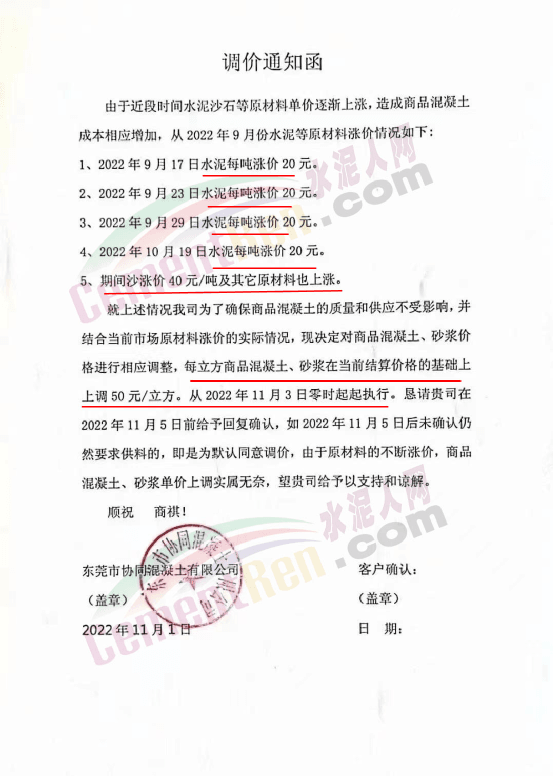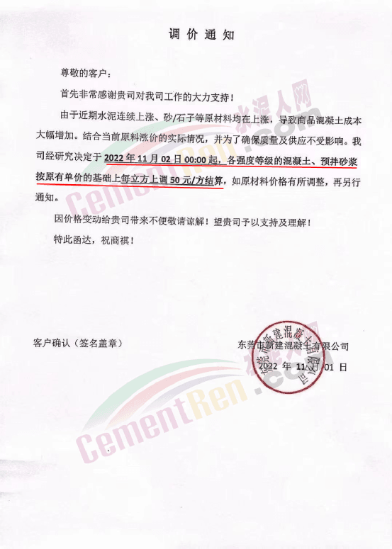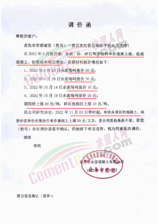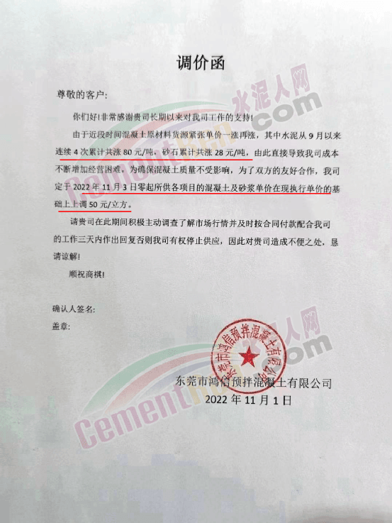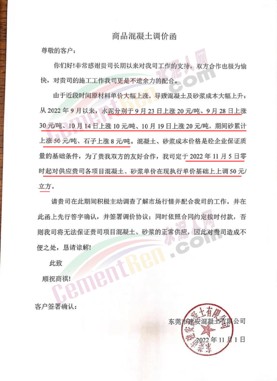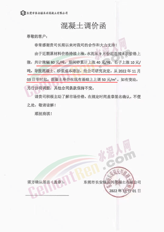 企業(yè)調(diào)價(jià)通知稱,從9月份開始,水泥、砂石等原材料上漲,造成混凝土企業(yè)生產(chǎn)成本增加,其中水泥4輪連漲,累計(jì)上漲80元/噸,砂上漲40-50元/噸,碎石上漲8-10元/噸?;炷疗髽I(yè)所供各項(xiàng)目的混凝土、砂漿價(jià)格跟進(jìn)上調(diào)50元/噸。