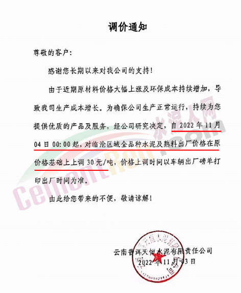 水泥人網(wǎng)消息:云南普洱天恒水泥有限責(zé)任公司通知由于近期原材料價格大幅上漲及環(huán)保成本持續(xù)增加,導(dǎo)致公司生產(chǎn)成本增長。為確保公司生產(chǎn)正常運行,經(jīng)公司研究決定,自2022年11月4日0時起,對臨滄區(qū)域全品種水泥及熟料出廠價格在原價格基礎(chǔ)上上調(diào)30元/噸,價格上調(diào)時間以車輛出廠磅單打印出廠時間為準。