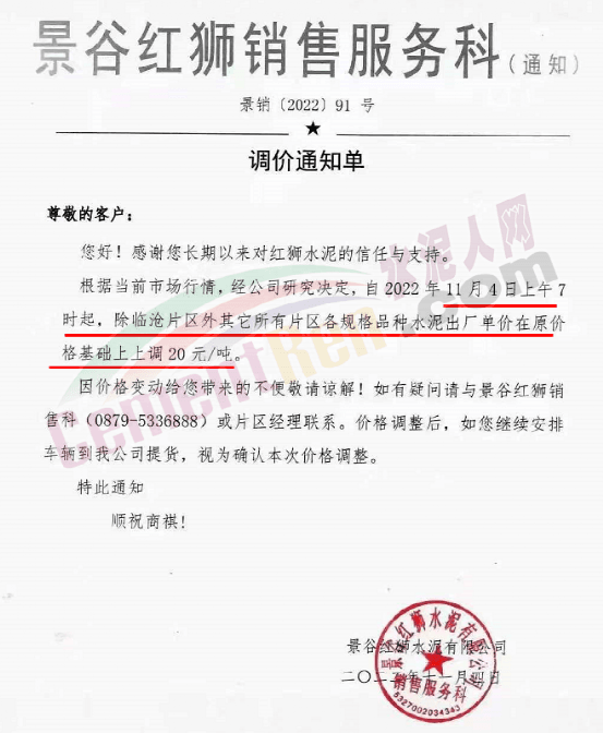 長寧紅獅銷售服務(wù)科通知,根據(jù)當前市場行情,經(jīng)公司研究決定,自2022年11月4日上午7 時起,各品牌規(guī)格水泥價格在原基礎(chǔ)上上調(diào)30元/噸。