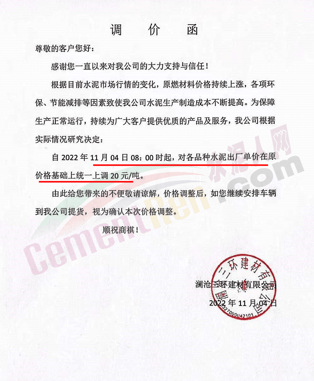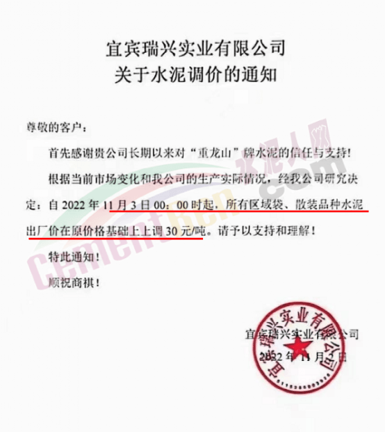 宜興實業(yè)有限公司通知,根據(jù)當前市場變化和公司的生產(chǎn)實際情況,經(jīng)公司研究決定自2022年11月3日0時起,所有區(qū)域袋、散裝品種水泥出廠價在原價格基礎(chǔ)上上調(diào)30元/噸。