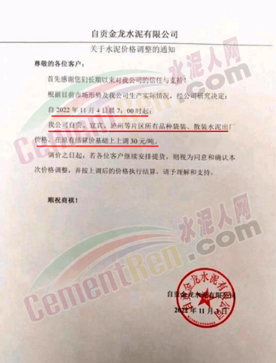 自貢金龍水泥有限公司通知,自11月4日晨7時起,公司自貢、宜賓、瀘州等片區(qū)所有品種袋裝、散裝水泥出廠價上調(diào)30元/噸。