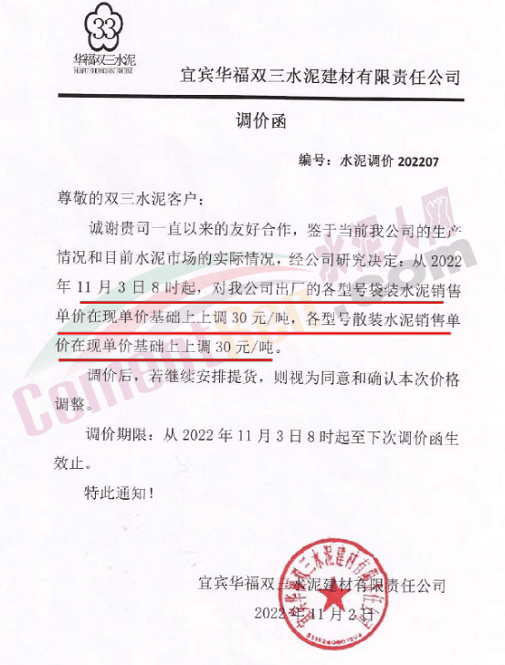 宜賓華福雙三水泥建材有限責(zé)任公司通知,11月3日8時起,公司各品種水泥上調(diào)30元/噸。