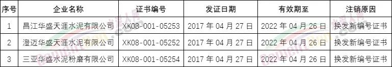 海南省3家水泥企業(yè)換發(fā)新編號(hào)證書,原證書注銷;