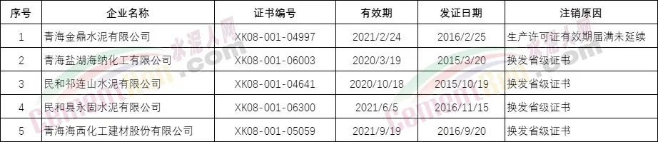 青海省注銷5家水泥企業(yè)生產(chǎn)許可證,其中一家許可證有效期屆滿未延續(xù),4家換發(fā)省級(jí)證書原證書注銷;
