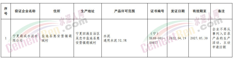 內(nèi)蒙古自治區(qū)1家水泥企業(yè)生產(chǎn)許可證被注銷;