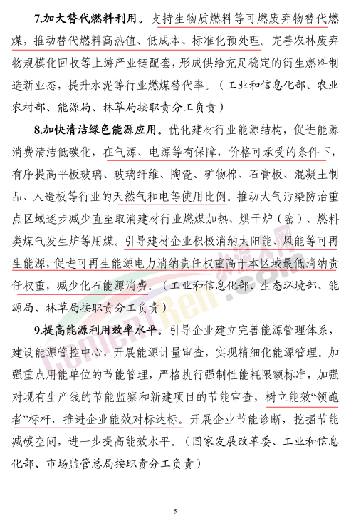工業(yè)和信息化部、國家發(fā)展和改革委員會、生態(tài)環(huán)境部、住房和城鄉(xiāng)建設(shè)部等四部門聯(lián)合印發(fā)《建材行業(yè)碳達峰實施方案》,方案提出“十四五”期間,建材產(chǎn)業(yè)結(jié)構(gòu)調(diào)整取得明顯進展,行業(yè)節(jié)能低碳技術(shù)持續(xù)推廣,水泥、玻璃、陶瓷等重點產(chǎn)品單位能耗、碳排放強度不斷下降,水泥熟料單位產(chǎn)品綜合能耗水平降低3%以上。“十五五”期間,建材行業(yè)綠色低碳關(guān)鍵技術(shù)產(chǎn)業(yè)化實現(xiàn)重大突破,原燃料替代水平大幅提高,基本建立綠色低碳循環(huán)發(fā)展的產(chǎn)業(yè)體系。確保2030年前建材行業(yè)實現(xiàn)碳達峰。