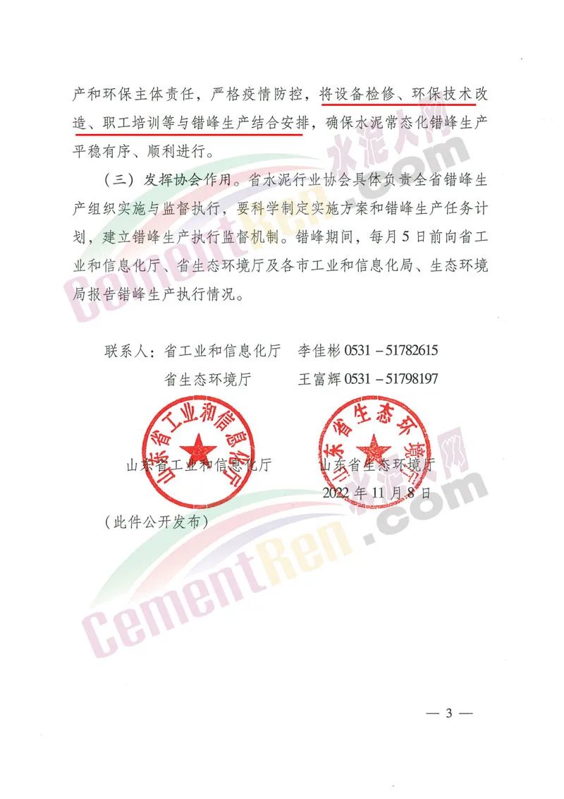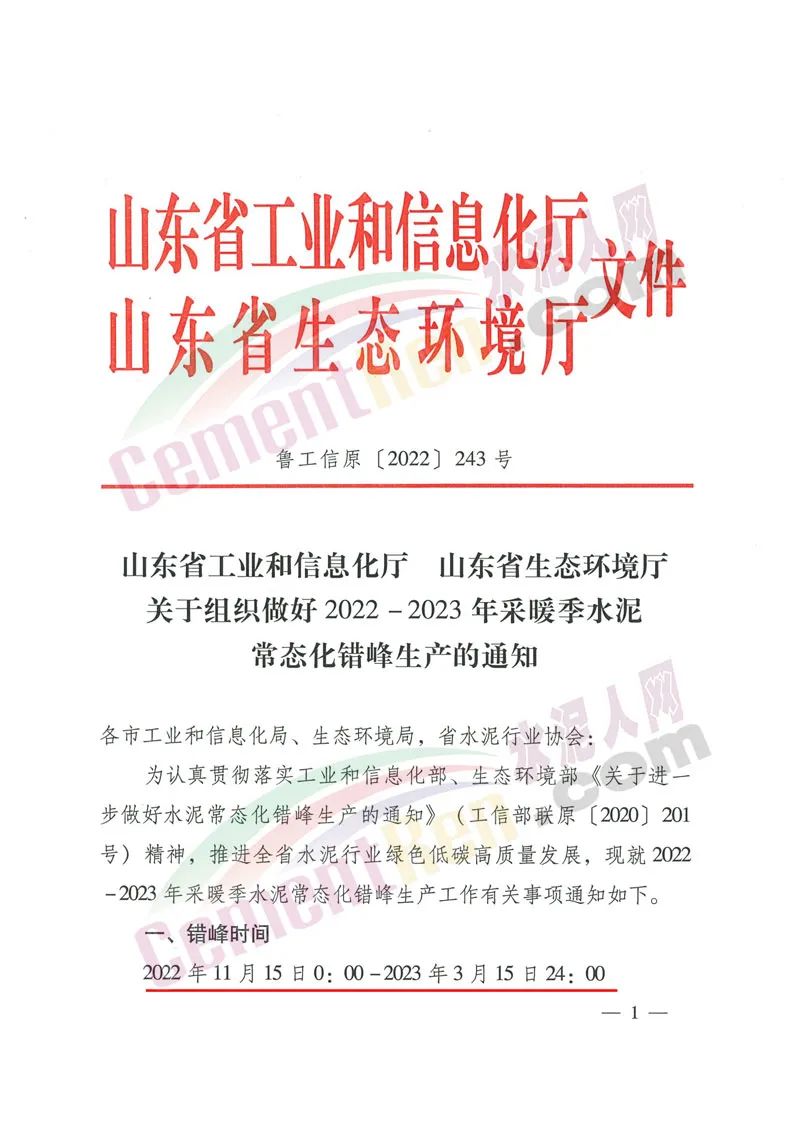 日前,山東省工業(yè)和信息化廳、山東省生態(tài)環(huán)境廳聯(lián)合印發(fā)《關(guān)于組織做好2022-2023年采暖季水泥常態(tài)化錯(cuò)峰生產(chǎn)的通知》(魯工信原〔2022]243號(hào))(以下簡(jiǎn)稱《通知》)要求,全省水泥熟料企業(yè)的所有熟料生產(chǎn)線(含特種水泥熟料生產(chǎn)線)從2022年11月15日0時(shí)至2023年3月15日24時(shí)執(zhí)行今冬明春采暖季常態(tài)化錯(cuò)峰生產(chǎn)任務(wù),共計(jì)4個(gè)月。承擔(dān)居民供暖任務(wù)的生產(chǎn)線、協(xié)同處置城市生活垃圾及有毒有害廢棄物等任務(wù)的生產(chǎn)線,可通過“錯(cuò)峰置換”方式,合理調(diào)整錯(cuò)峰時(shí)間,在非采暖季補(bǔ)足錯(cuò)峰時(shí)間。