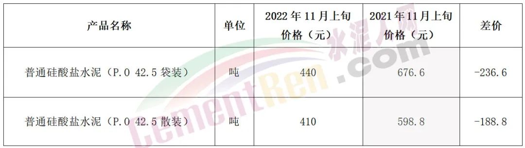 煤價持續(xù)高位導(dǎo)致水泥生產(chǎn)企業(yè)成本持續(xù)增長,利潤大幅收窄。無奈今年前幾個月水泥價格持續(xù)下跌,以至于多區(qū)域長期磨底。國家統(tǒng)計(jì)局?jǐn)?shù)據(jù)顯示,截至11月上旬P.O42.5散裝水泥報價剛剛突破400元/噸。較上年同期相差188.8元/噸,P.O 42.5袋裝水泥相差236.6元/噸。