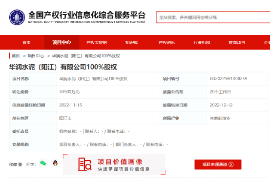 11月15日,全國產(chǎn)權(quán)行業(yè)信息化綜合服務(wù)平臺(tái)披露華潤水泥控股(香港)有限公司(以下簡稱“華潤水泥控股(香港)”)掛牌轉(zhuǎn)讓華潤水泥(陽江)有限公司(以下簡稱“華潤水泥(陽江)”)100%股權(quán),轉(zhuǎn)讓底價(jià)3.45億元,信息披露起止日為2022年11月15日至2022年12月12日。
