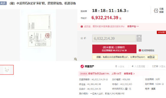 本次變賣標(biāo)的所指的標(biāo)的物,房屋建筑物、構(gòu)筑物及其他輔助設(shè)施、機(jī)器設(shè)備評估價(jià)值為301.49萬元,水泥用石灰?guī)r礦采礦權(quán)評估咨詢價(jià)值為865.14萬元,采礦權(quán)資源價(jià)款為86.7605萬元,合計(jì)1253.3905萬元。