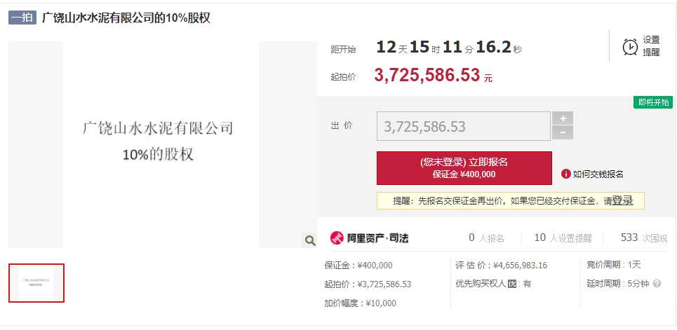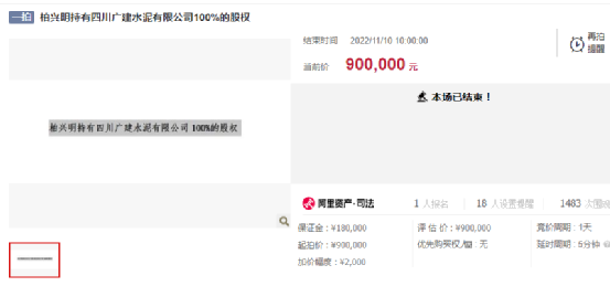 水泥人網(wǎng)注意到于11月10日10時(shí)結(jié)束的“柏興明持有四川廣建水泥有限公司100%的股權(quán)”公開拍賣,當(dāng)前價(jià)為90萬元。