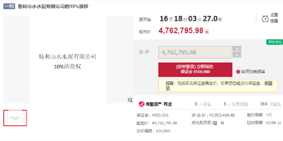拍賣對象為勝利油田營海實(shí)業(yè)集團(tuán)有限公司所持有的在墾利山水水泥有限公司的10%股權(quán)。評估價(jià):5953494.98元,起拍價(jià):4762795.98元,保證金:500000元,增價(jià)幅度:10000元。