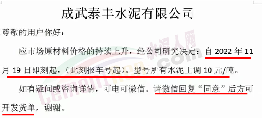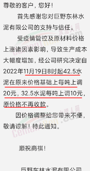 山東省菏澤市巨野東林水泥有限公司通知,受疫情管控及原材料價格上漲諸因素影響,導(dǎo)致生產(chǎn)成本大幅度增加,經(jīng)公司研究決定自2022年11月19日8時起42.5水泥在原來價格基礎(chǔ)上每噸上調(diào)20元,32.5水泥每噸上調(diào)10元,原價格不再收款。