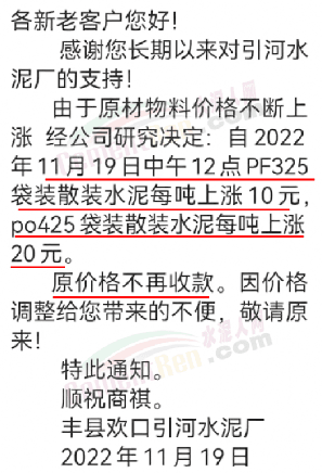 豐縣歡口引河水泥廠通知,由于原材物料價格不斷上漲,經(jīng)公司研究決定自2022 年11月19日中午12點P.F325 袋裝散裝水泥每噸上漲10元,PO425袋裝散裝水泥每噸上漲20元,原價格不再收款。