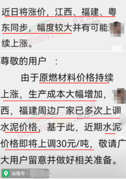 廣東汕尾區(qū)域某水泥銷售企業(yè)通知,近日水泥價格將上漲,江西、福建、粵東區(qū)域剛同步調(diào)漲,且幅度較大,并有可能繼續(xù)上漲。
