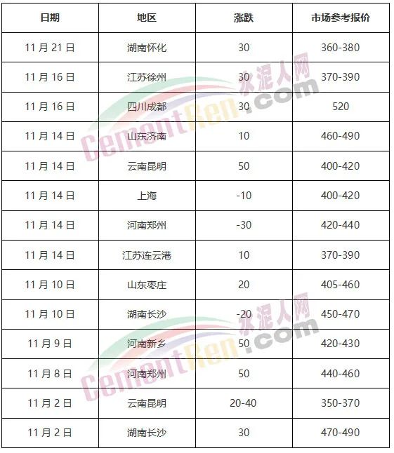據(jù)水泥人網(wǎng)近期報道,經(jīng)歷了前三季度量價齊跌后,進(jìn)入11月以來,重慶、四川、河南、江蘇等20多個省份水泥價格上調(diào)10~80元/噸。云南昆明區(qū)域近期連續(xù)多次上調(diào)水泥價格,累計漲超120元/噸。