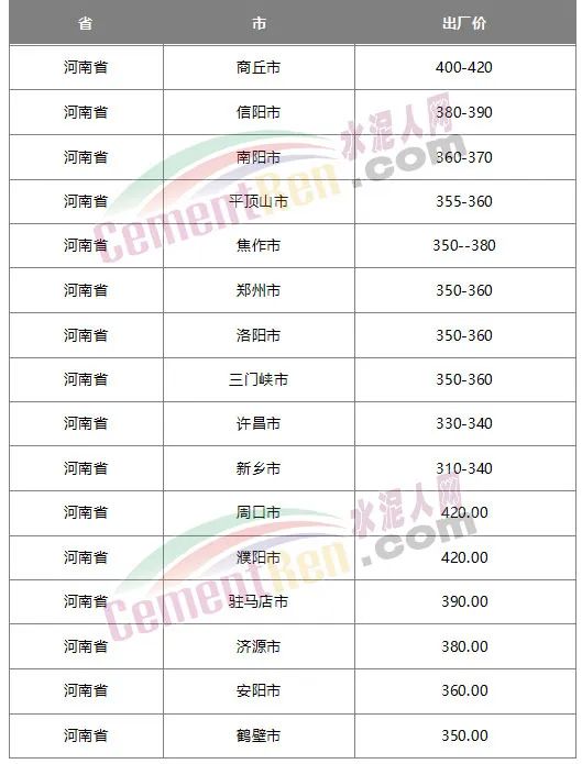 河南省內(nèi)各區(qū)域水泥出廠參考報價一覽