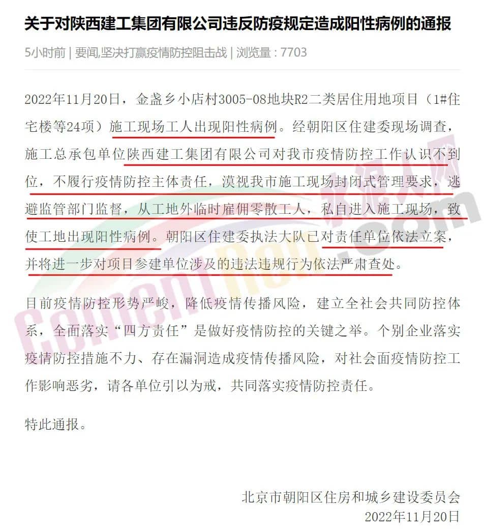 11月20日,據(jù)北京市朝陽區(qū)住建委通報,2022年11月20日,金盞鄉(xiāng)小店村3005-08地塊R2二類居住用地項目(1#住宅樓等24項)施工現(xiàn)場工人出現(xiàn)陽性病例。經(jīng)朝陽區(qū)住建委現(xiàn)場調(diào)查,施工總承包單位陜西建工集團有限公司對北京市疫情防控工作認(rèn)識不到位,不履行疫情防控主體責(zé)任,漠視北京市施工現(xiàn)場封閉式管理要求,逃避監(jiān)管部門監(jiān)督,從工地外臨時雇傭零散工人,私自進入施工現(xiàn)場,致使工地出現(xiàn)陽性病例。朝陽區(qū)住建委執(zhí)法大隊已對責(zé)任單位依法立案,并將進一步對項目參建單位涉及的違法違規(guī)行為依法嚴(yán)肅查處。